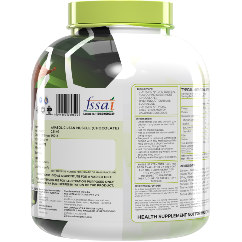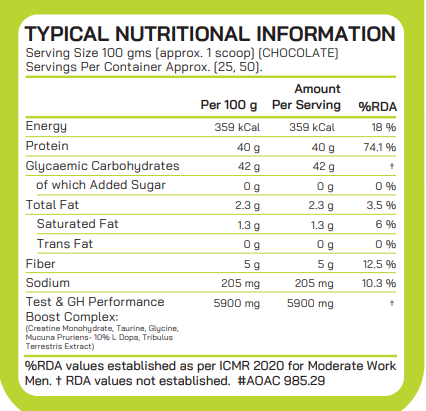 Complex Carbohydrate Matrix (Maltodextrin, Potato Starch, Rice Flour), High Biological Value Protein Blend (Whey Protein Concentrate, Pea Protein, Fat Free Milk Solids), Cocoa Powder, Test & GH Performance Boost Complex (Creatine Monohydrate – 3gms per serving, Taurine, Glycine, Mucuna Pruriens – 10% L Dopa, Tribulus Terrestris Extract), Flavouring, Xanthan Gum (INS 415), Sodium Chloride, Sucralose (INS 955).